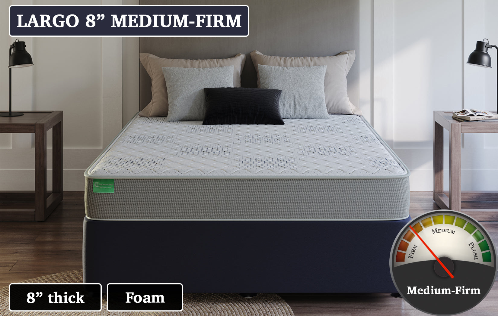 "An affordable yet high-quality foam mattress offering cushion-firm comfort. It features a soft top layer over a firm support base, providing just the right amount of cushioning. Ideal for occasional use or budget-conscious buyers, the Largo 8" Medium-Firm is a great value."